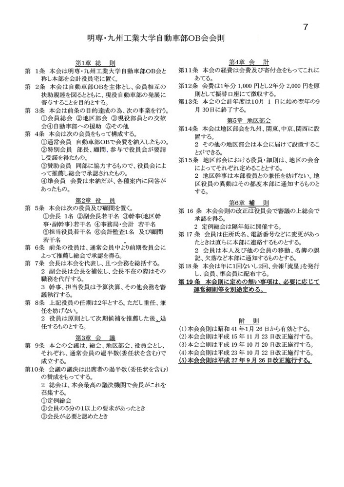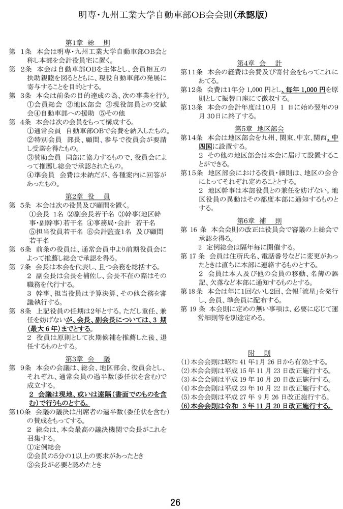 第1条 本会は明専・九州工業大学自動車部OB会と称し本部を会計役員宅に置く。